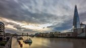Londyn, Anglia - piękny golden sunrise w London Tower Bridge, Katedra St.Paul 's i drapaczy chmur w dzielnicy bankowej. Dramatyczne ciemne chmury na tle