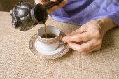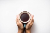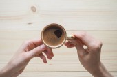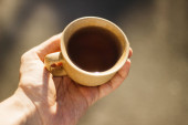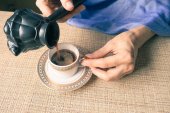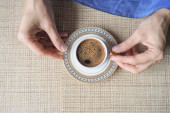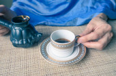 Filiżankę kawy. Filiżanka kawy w rękach kobiet. Komfort w domu.