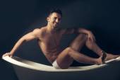 Przystojny muskularny mężczyzna pozowanie na kanapie w krótkich spodenkach, moda portret przystojny młodzieniec
