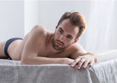 Przystojny muskularny mężczyzna pozowanie na kanapie w krótkich spodenkach, moda portret przystojny młodzieniec