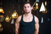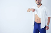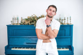 Miło, przystojny mężczyzna z brodą w białe szaty, na tle fortepian, rasped koszulkę z nagi tors
