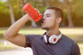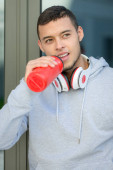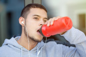 Młody mężczyzna jedzenie jogurt w kuchni portret formacie zdrowy e
