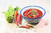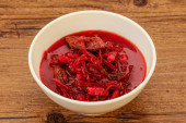 Barszcz - barszcz w misce biały na tle drewnianych, tradycyjne danie kuchni ukraińskiej. Widok z góry.