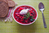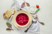 Barszcz - barszcz w misce biały na tle drewnianych, tradycyjne danie kuchni ukraińskiej. Widok z góry.