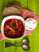 Barszcz - barszcz w misce biały na tle drewnianych, tradycyjne danie kuchni ukraińskiej. Widok z góry.