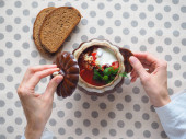 Zdjęcie "Barszcz - barszcz w misce biały na tle drewnianych, tradycyjne danie kuchni ukraińskiej. Widok z góry." może być wykorzystywane do celów osobistych i komercyjnych zgodnie z warunkami zakupionej licencji Royalty-free. Obraz jest dostępny do pobrania w jakości wysokiej rozdzielczości do 5760x3840.