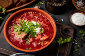 Zdjęcie "Tradycyjny barszcz ukraiński. Rosyjski wegetariańska zupa czerwony w białe miski" może być wykorzystywane do celów osobistych i komercyjnych zgodnie z warunkami zakupionej licencji Royalty-free. Obraz jest dostępny do pobrania w jakości wysokiej rozdzielczości do 5760x3840.