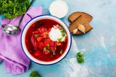 Zdjęcie "Tradycyjny barszcz ukraiński. Rosyjski wegetariańska zupa czerwony w białe miski" może być wykorzystywane do celów osobistych i komercyjnych zgodnie z warunkami zakupionej licencji Royalty-free. Obraz jest dostępny do pobrania w jakości wysokiej rozdzielczości do 5760x3840.