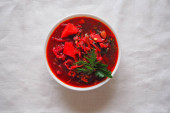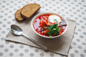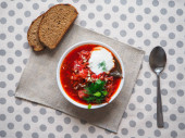 Tradycyjny barszcz ukraiński. Rosyjski wegetariańska zupa czerwony w białe miski