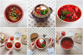 Tradycyjny barszcz ukraiński. Rosyjski wegetariańska zupa czerwony w białe miski