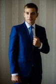 Przystojny mężczyzna w garniturze przeciwko czarny mur, model zdjęcie. Udane modne mężczyzna