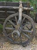 Stary drewniany wózek koło. Pojęcie przestarzałe technologie, ekoturystyka