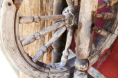 Stary drewniany wózek koło. Pojęcie przestarzałe technologie, ekoturystyka