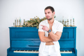 Przystojny, młody człowiek w sportowej na białym tle, Zdjęcie modelu.