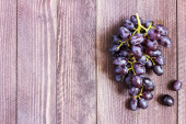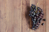 Widok z góry gałęzi dojrzałych czerwonych winogron na drewnianym stole
