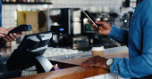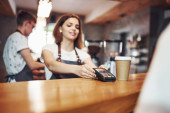 przycięte strzał klient płaci kartą kredytową i barista z terminali i kawa filiżanki w ręce