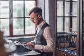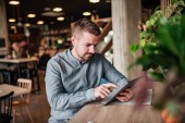 młody mężczyzna barista, patrząc na zegarek i siedzi przy stole z laptopa w kawiarni