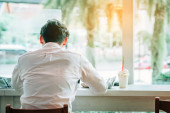 Zdjęcie "Widok z boku z młody mężczyzna barista picia kawy z papierowy kubek i komputera przenośnego " może być wykorzystywane do celów osobistych i komercyjnych zgodnie z warunkami zakupionej licencji Royalty-free. Obraz jest dostępny do pobrania w jakości wysokiej rozdzielczości do 5760x3840.