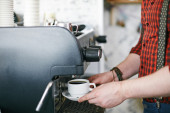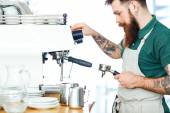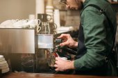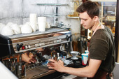 skadrowana młody mężczyzna barista w fartuch przy użyciu maszyny do kawy