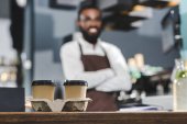 Afryki amerykański klienta przytrzymanie puste schowka i ogląda Brodaty barista w kawiarni