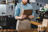 przycięte strzał uśmiechający się african american barista trzymając znak otwartego w kawiarni