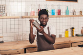 przystojny młody Afroamerykanin barista w okularach, uśmiechając się aparatu podczas parzenia kawy w ekspresie