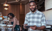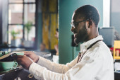 młody Afroamerykanin barista trzymając kubek kawy i korzysta z laptopa w kawiarni