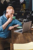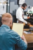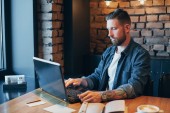 widok boczny przystojny Brodaty mężczyzna młody za pomocą laptopa z pusty ekran w kawiarni
