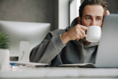 Zdjęcie "Przystojny młody człowiek pije kawę i używa laptopa w kawiarni" może być wykorzystywane do celów osobistych i komercyjnych zgodnie z warunkami zakupionej licencji Royalty-free. Obraz jest dostępny do pobrania w jakości wysokiej rozdzielczości do 5760x3840.