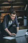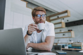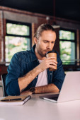 Przystojny młody człowiek pije kawę i używa laptopa w kawiarni