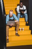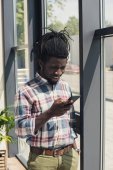 Widok z boku z młodych african american bartender smartfona w kawiarni