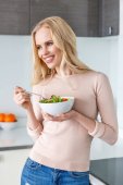 wegańskie atrakcyjny dziewczynka gospodarstwa papryka w kuchni i patrząc na kamery