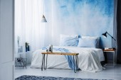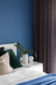 Zdjęcie "Kobalt niebieski sypialnia z łóżkiem" może być wykorzystywane do celów osobistych i komercyjnych zgodnie z warunkami zakupionej licencji Royalty-free. Obraz jest dostępny do pobrania w jakości wysokiej rozdzielczości do 5760x3840.