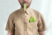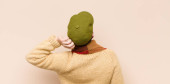 zasłonięte widok zamyślony człowiek z savoy kapusta liść na twarzy, wegańskie lifestyle concept