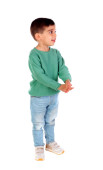 uśmiechający się mały chłopiec w zielone ubrania na białym tle