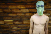 zasłonięte widok człowieka z savoy kapusta liść i okulary na twarzy, wegańskie lifestyle concept