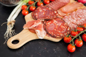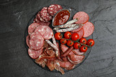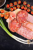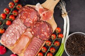 Widok z góry na różne rodzaje plasterki szynki, proscuitto i salami