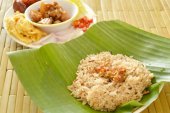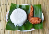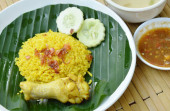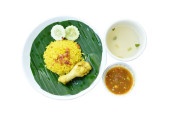 ryż gotowany z kurczakiem w curry na talerzu i zupie