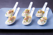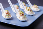 Zdjęcie "Zakąska z wodorostów chuka, kraby i kawior na porcje spoos. Selektywny fokus, zbliżenie." może być wykorzystywane do celów osobistych i komercyjnych zgodnie z warunkami zakupionej licencji Royalty-free. Obraz jest dostępny do pobrania w jakości wysokiej rozdzielczości do 5760x3840.
