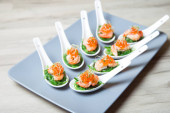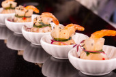 Zakąska z wodorostów chuka, kraby i kawior na porcje spoos. Selektywny fokus, zbliżenie.