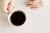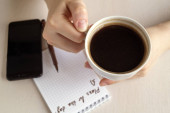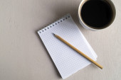Widok z góry listy celów dla dnia, filiżankę kawy na bri