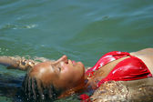 portret atrakcyjne i piękne dziewczyny, leżące w pobliżu wody w bieliźnie różowy