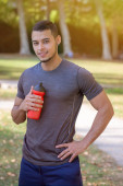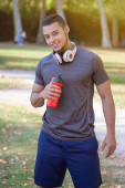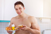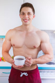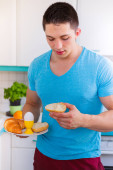 Jedzenie śniadania młody człowiek w kuchni portret format smilin