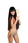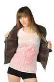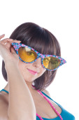 Uśmiechnięta piękna dziewczyna w okularach na białym