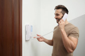 Zdjęcie "Młody człowiek, wprowadzając kod na system alarmowy, wewnątrz" może być wykorzystywane do celów osobistych i komercyjnych zgodnie z warunkami zakupionej licencji Royalty-free. Obraz jest dostępny do pobrania w jakości wysokiej rozdzielczości do 5760x3840.