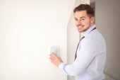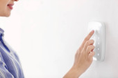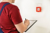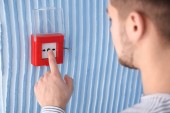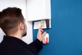 Młody człowiek, wprowadzając kod na system alarmowy, wewnątrz
