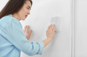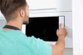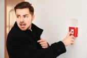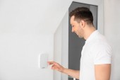 Młody człowiek, wprowadzając kod na system alarmowy, wewnątrz