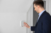 Zdjęcie "Młody człowiek, wprowadzając kod na system alarmowy, wewnątrz" może być wykorzystywane do celów osobistych i komercyjnych zgodnie z warunkami zakupionej licencji Royalty-free. Obraz jest dostępny do pobrania w jakości wysokiej rozdzielczości do 5760x3840.
