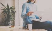 Zdjęcie "Młoda piękna kobieta blonde siedząc w wygodnym fotelu i przy użyciu komputera przenośnego. Praca proces w coworkingowa studio. Panoramiczne okna na niewyraźne tło." może być wykorzystywane do celów osobistych i komercyjnych zgodnie z warunkami zakupionej licencji Royalty-free. Obraz jest dostępny do pobrania w jakości wysokiej rozdzielczości do 5760x3840.