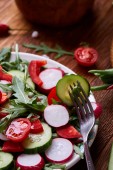 Świeże, czerwone rzodkiewki w drewniane miski wśród płyt z warzyw, zioła i przyprawy i, widok z góry, Selektywny fokus.